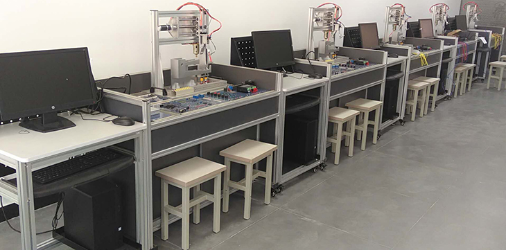 單片機(jī)控制功能實(shí)訓(xùn)考核裝置采用烤漆鋼板制作的臺(tái)式結(jié)構(gòu)。實(shí)訓(xùn)臺(tái)的抽屜柜用于存放實(shí)訓(xùn)模塊,抽屜柜與臺(tái)面之間布置實(shí)訓(xùn)模塊安裝支架,最上一層是工作臺(tái)臺(tái)面。用于技能競(jìng)賽時(shí)在臺(tái)面上放置設(shè)備安裝底板,在底板上安裝試題擬定的單片機(jī)控制裝置需要的模塊,連接控制電路,編寫的控制程序輸入單片機(jī)后,按下運(yùn)行指令開關(guān),單片機(jī)控制裝置就按程序運(yùn)行。