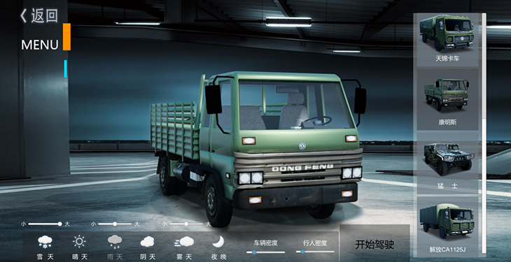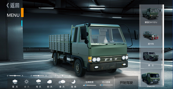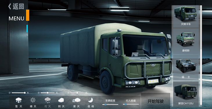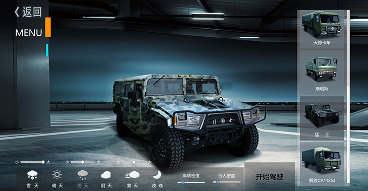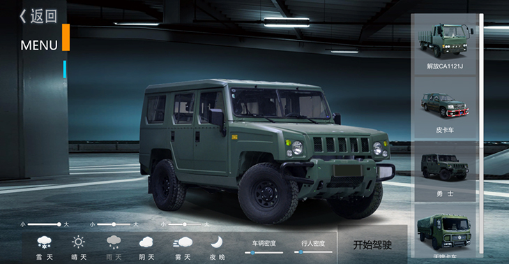 7.1、仿真車模型:10 種典型虛擬車輛模型:東風(fēng)猛士、北汽勇士、 EQ1118、EQ1121、 EQ2102、SX2150、SX2190、豪濼 ZZ2197、東風(fēng)天錦、大客車等,并可根據(jù)需要拓展、定制個 性化車輛模型。