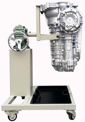 采用減速翻轉(zhuǎn)機(jī)構(gòu),可使變速器旋轉(zhuǎn)任意角度,并能任意位置鎖止,便于學(xué)生從不同的角度進(jìn)行拆卸和裝配。