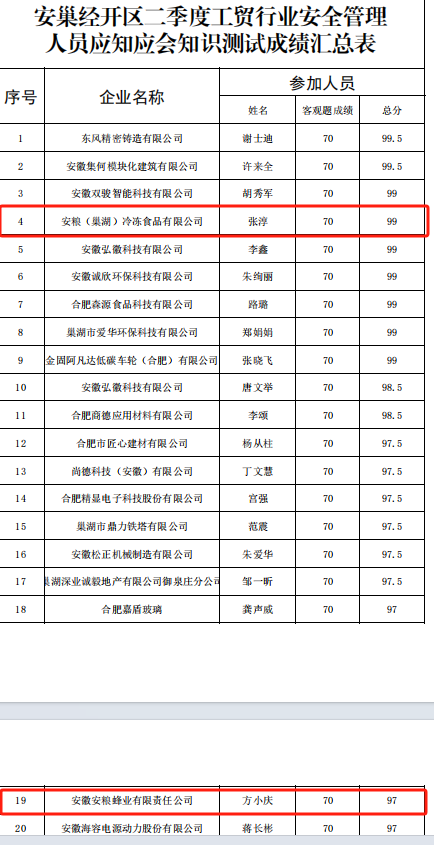 經(jīng)過激烈角逐,我司選手表現(xiàn)出色,安糧冷庫張淳同志憑借扎實的專業(yè)知識和出色的應(yīng)試能力榮獲第二名,安糧蜂業(yè)方小慶同志也緊隨其后,榮獲第五名。這兩位同志的優(yōu)異成績不僅彰顯了安糧巢湖食品工業(yè)園在安全管理工作方面的突出成效,也為我司贏得了榮譽。