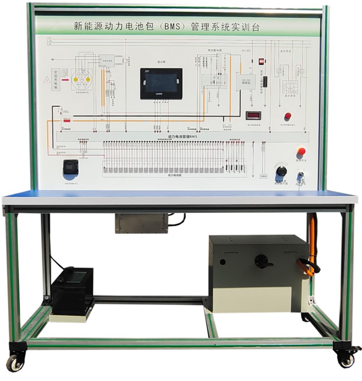 磷酸鐵鋰動力電池包與鐵制電池箱(單體電池3.2V 20AH,24串)、BMS鋰電管理一體機、動力電池包觸摸顯示屏、車載充電機、國標充電插口、國標充電槍、緊急斷電開關(guān)、霍爾電流傳感器、直流接觸器(包含充電繼電器、總正繼電器、總負繼電器、預(yù)充繼電器)、DC-DC轉(zhuǎn)換器(72V-12V30A)、輔助蓄電池(12V45AH)、放電控制繼電器與放電負載電阻、預(yù)充電阻器、可移動實訓臺(1500×700×1700mm 帶自鎖腳輪裝置,帶安裝檢測端子的原理面板,面板1448×940mm)、故障模擬與排除裝置、設(shè)備操作說明書。