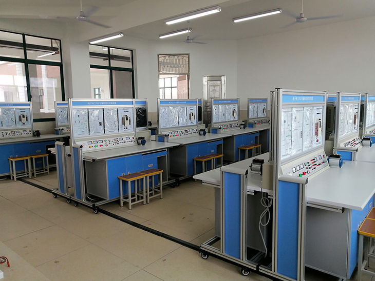 電子電工與PLC實訓(xùn)室配置有西門子公司S7-1200系列PLC作為控制核心,同時配套有流水燈、港口起重機、十字路交通燈、三層電梯、天塔之光等預(yù)設(shè)實訓(xùn)模塊。其附帶有7英寸彩色觸摸屏,通信下載編程電纜,觸摸屏與PLC通信電纜,開發(fā)組態(tài)軟件等配套設(shè)備,構(gòu)建了完全真實的PLC項目開發(fā)環(huán)境,便于學(xué)生演練PLC項目開發(fā)的全套流程。同時,實訓(xùn)設(shè)備外掛了電子實訓(xùn)模塊,可供學(xué)生進(jìn)行電子相關(guān)實訓(xùn)。該實訓(xùn)室利用多媒體教學(xué)、網(wǎng)絡(luò)教學(xué)等先進(jìn)手段,將復(fù)雜知識點簡單化,將實訓(xùn)內(nèi)容與工作任務(wù)融合為一,實現(xiàn)了一體化教學(xué)的目的。